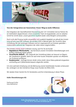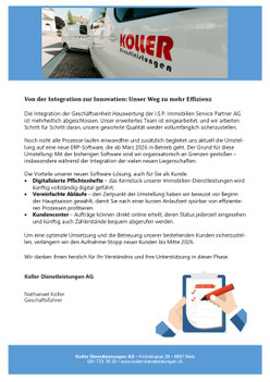 Mels, Dezember 2025 – Die Integration der Geschäftseinheit Hauswartung der I.S.P. Immobilien Service Partner AG ist mehrheitlich abgeschlossen. Unser Team ist eingearbeitet, und wir optimieren Prozesse Schritt für Schritt.